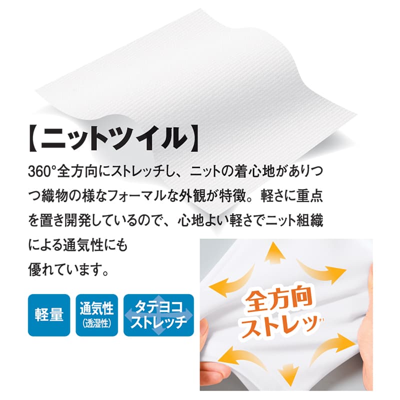 360°全方向にストレッチし、ニットの着心地がありつつ織物の様なフォーマルな外観が特徴。軽さに重点を置き開発しているので、心地よい軽さでニット組織による通気性にも優れています。