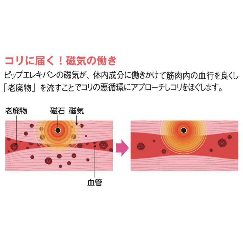 ピップエレキバンの磁気が、体内成分に働きかけて筋肉内の血行を良くし「老廃物」を流すことでコリの悪循環にアプローチしコリをほぐします。