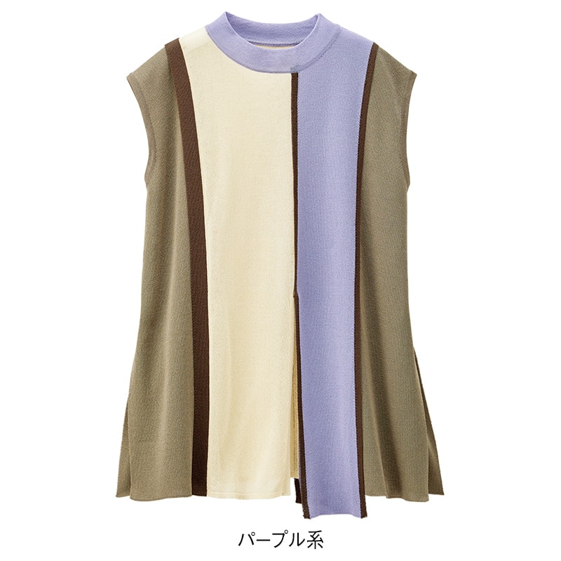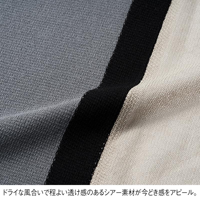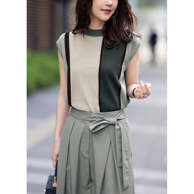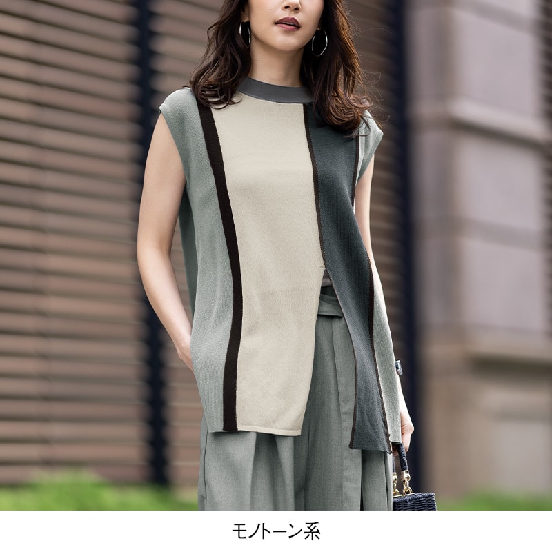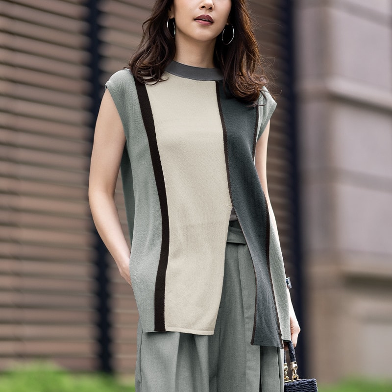 縦の配色使いと華奢魅せを叶えるフレンチスリーブ、抜け感が生まれるスリット入りでスタイルアップが狙えるプルオーバーです。