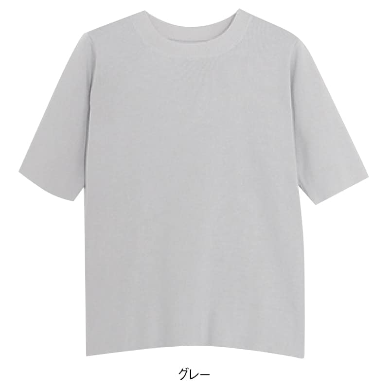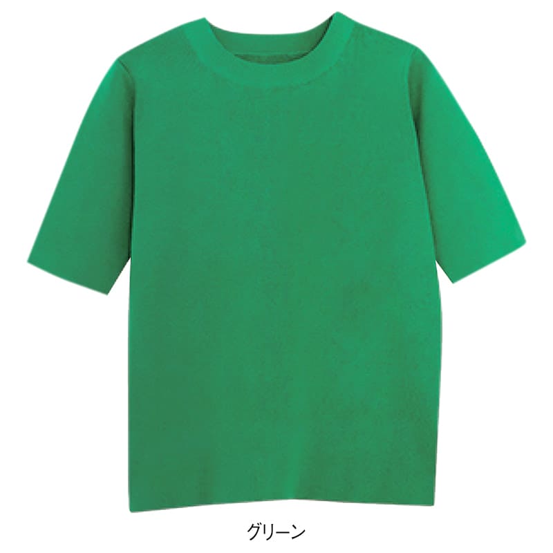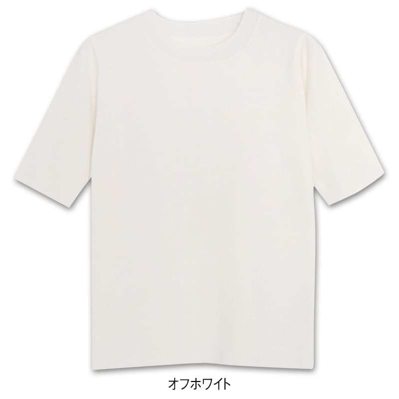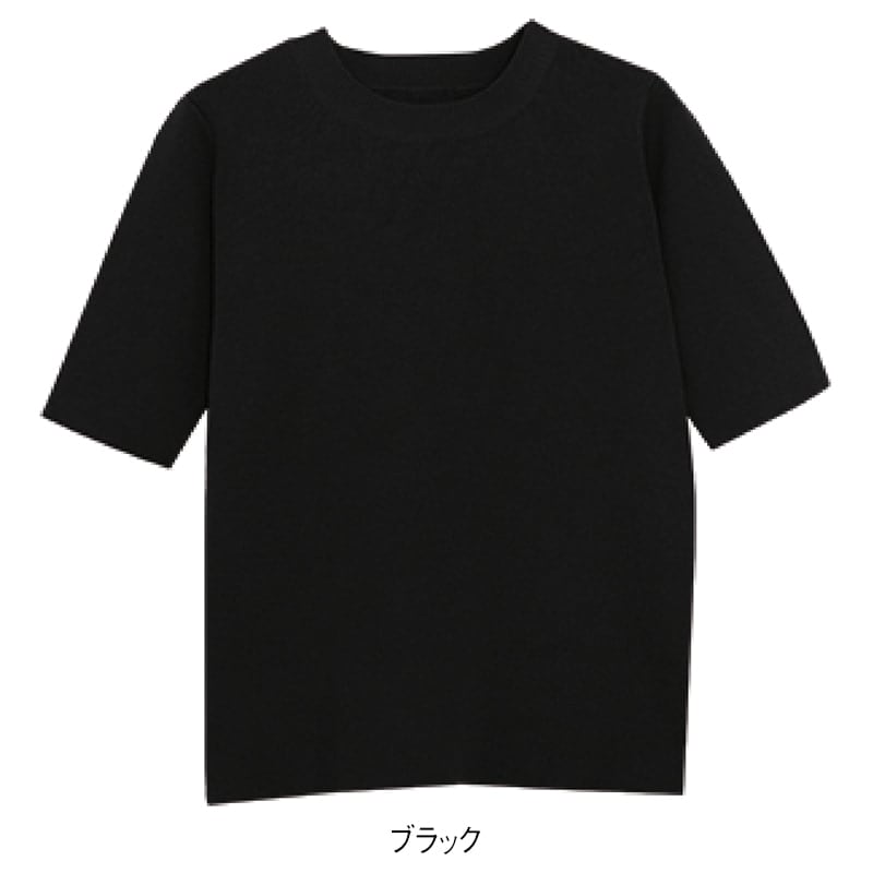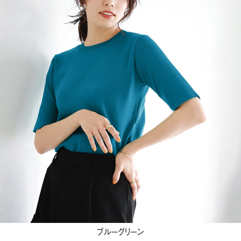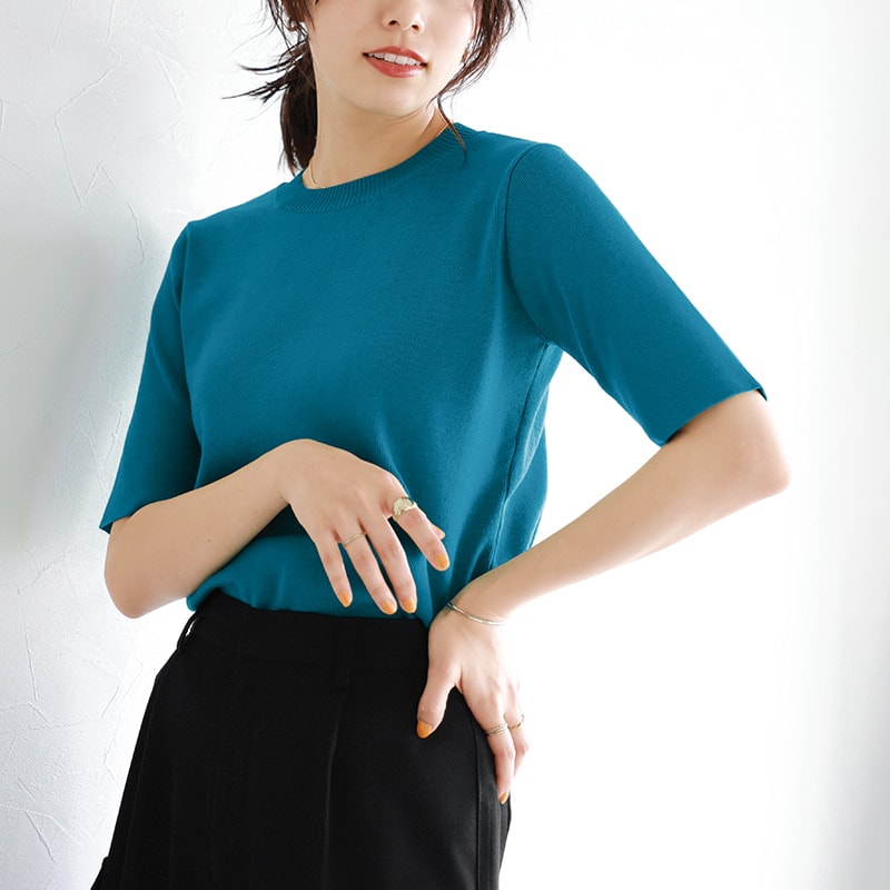 腕周りを細く見せる五分丈袖と、程よく詰まったネックラインがバランスの良い仕上がりに。