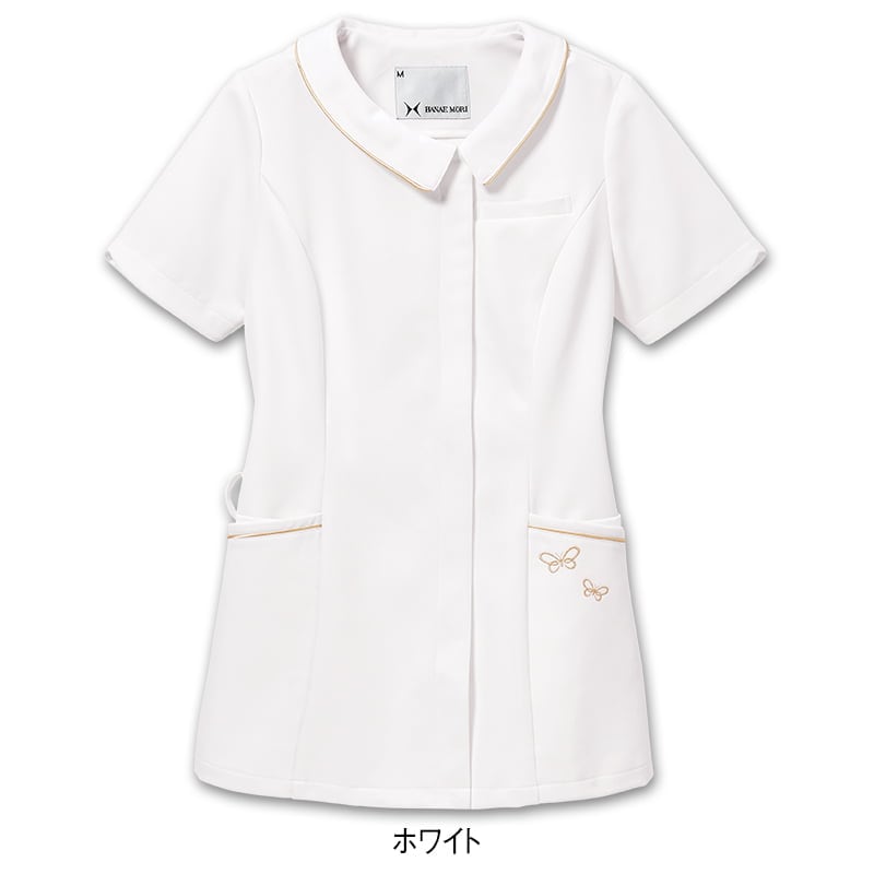 ハナエモリの白衣に使用している「ストレッチツイル」は国産生地で、その機能は優れた制電、防縮、制菌性を備えて肌あたりよく、シワにもなりにくく、さらに上質な風合いなので仕立て映えします。