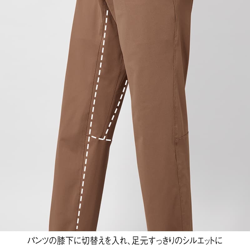 パンツの膝下に切替えを入れ、足元すっきりのシルエットに。