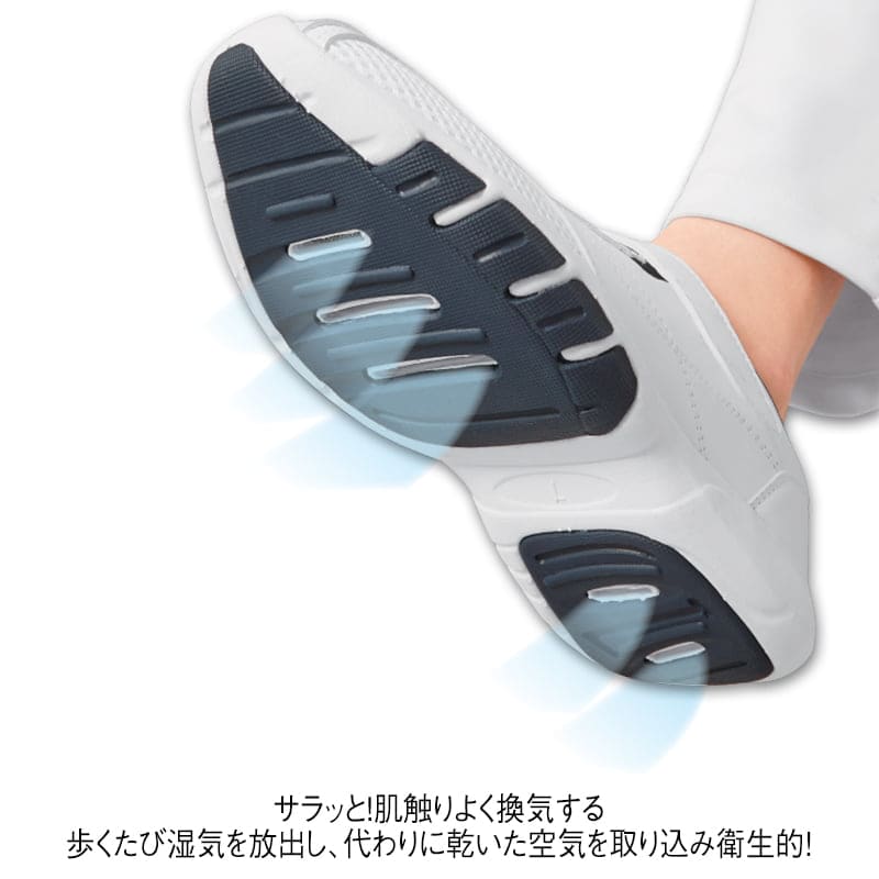 底裏に通気口があり、ムレを放出!伸縮ベルトで脱ぎ履き簡単なベンチレーションシューズ