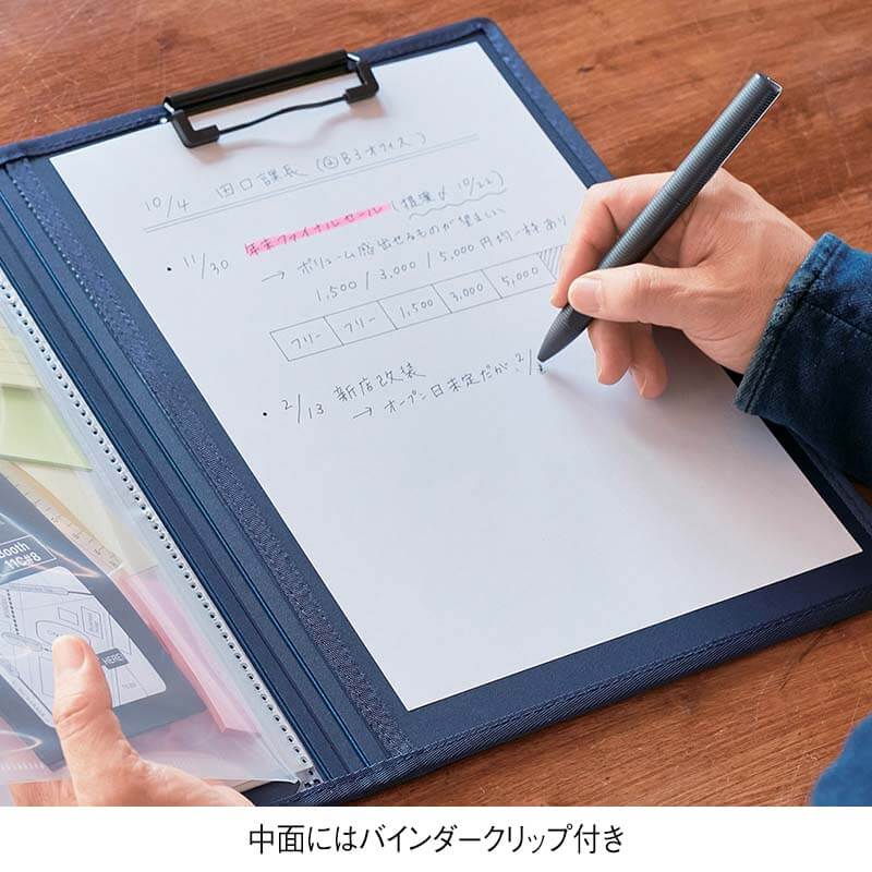 オープンポケット、ペンホルダー、チャック付きポケット、名刺ポケット、クリアポケット(A4)5枚