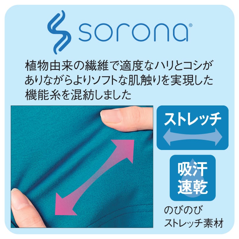 植物由来の繊維「SORONA(R)」を混紡しているため、持続的なストレッチ性と、シワになりにくい回復保持性、柔らかくふわっとした風合いとハリ感、鮮やかな色彩に優れています。