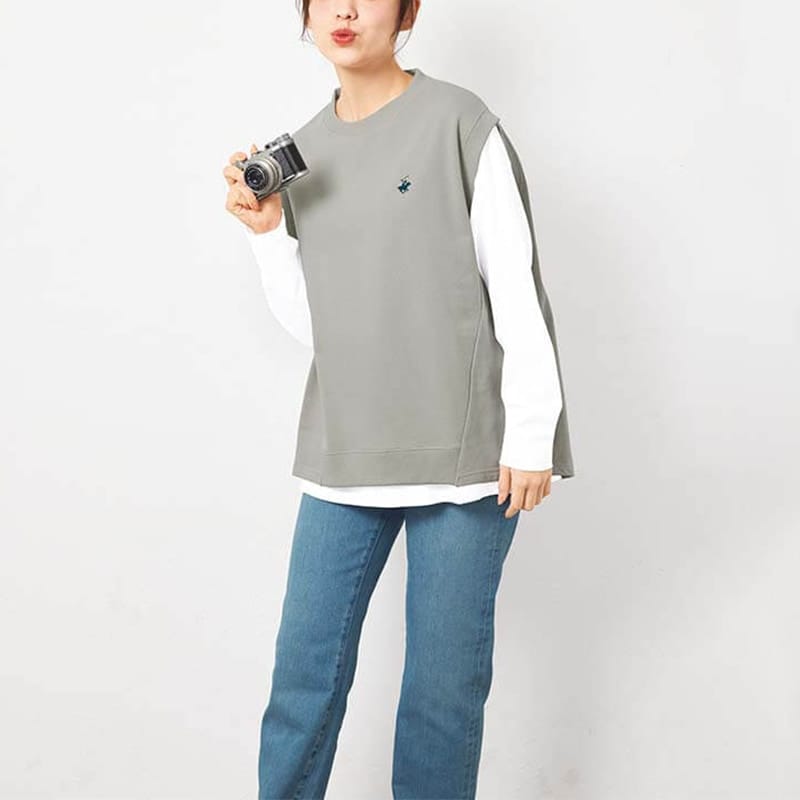 斜め切替えデザインでスッキリ見え!おしゃれに決まる重ね着スタイルが実現。