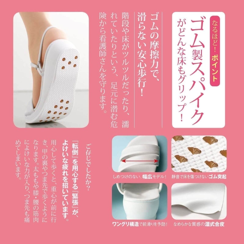 これを知るまで何種類かナースサンダルを試しましたが足が細めだからかつま先がかなり出てしまう、少し走るとつるつる脱げる‥など困っていました。
