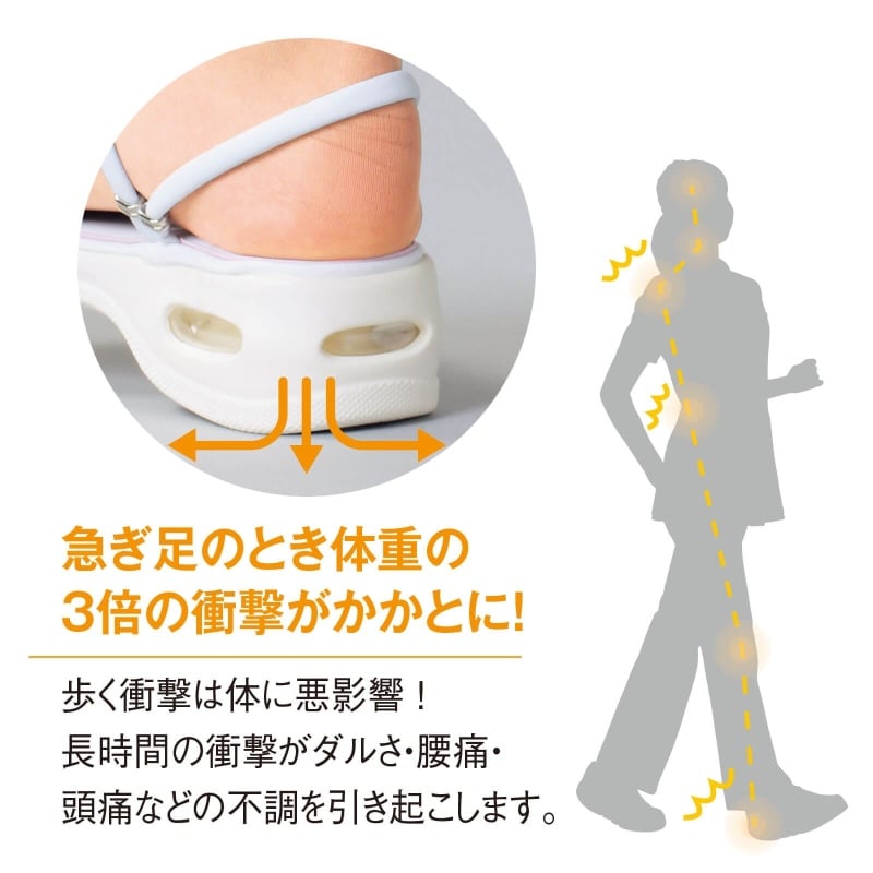 【地面を蹴り返す反発力】強い衝撃を受け続けるかかと。エア入りならその衝撃を吸収後床に分散。影響を緩和して疲れが軽減します。