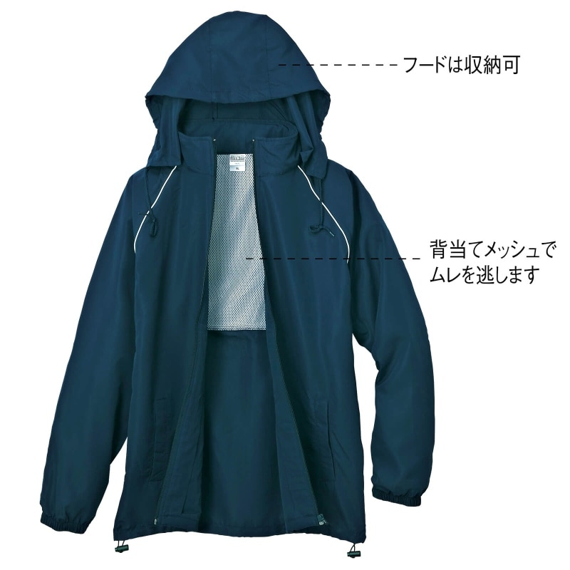 ●衿元収納フード付き、フード・裾スピンドルひも入り、背裏メッシュ仕様