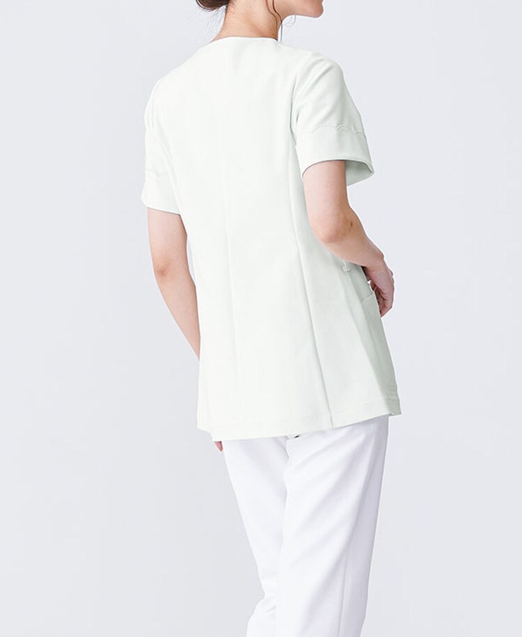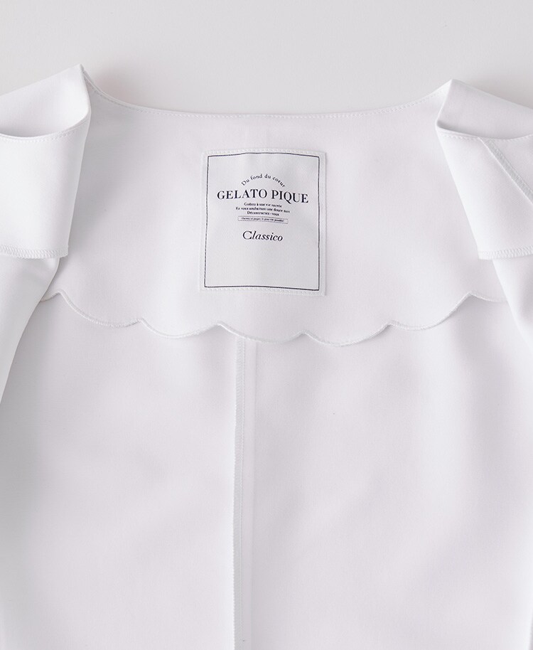 デコルテを美しく見せるノーカラー。着脱するたび気持ちがなごむ袖口のスカラップ使いもポイント。