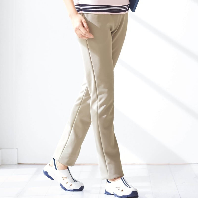 そして気にしていた裾幅はだいたい16センチくらいで、ほっそりいい感じ!素材がよく伸びるので窮屈なことも全くなく、体のラインを拾いすぎないです。