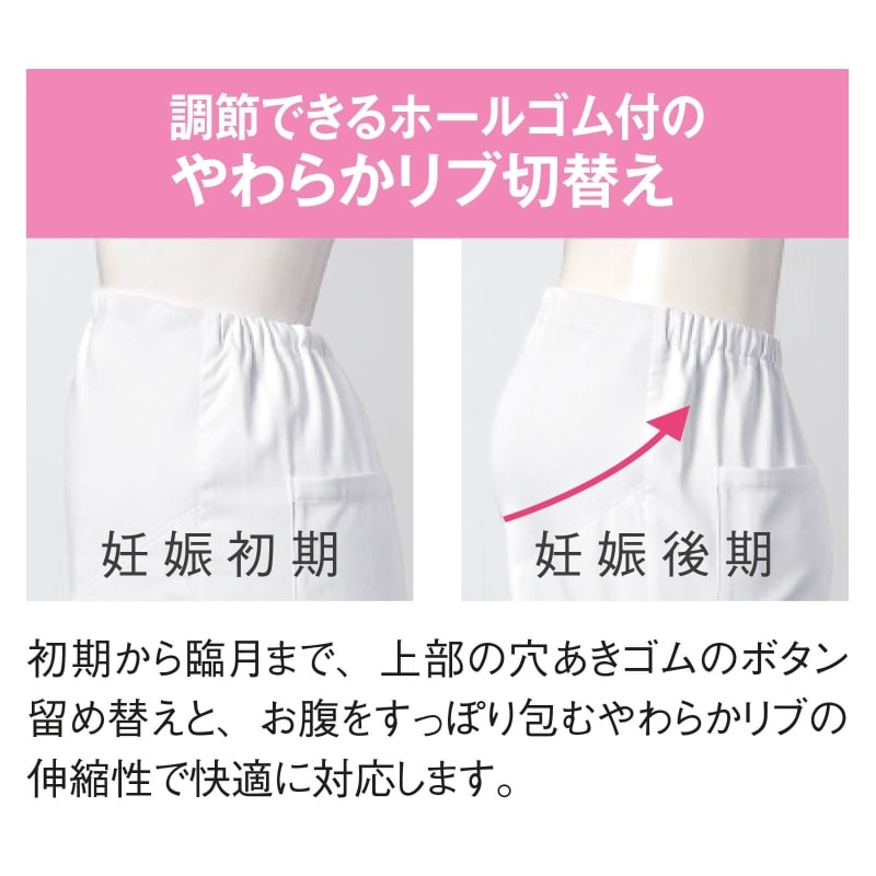 初期から臨月まで、上部の穴あきゴムのボタン留め替えと、お腹をすっぽり包むやわらかリブの伸縮性で快適に対応します。