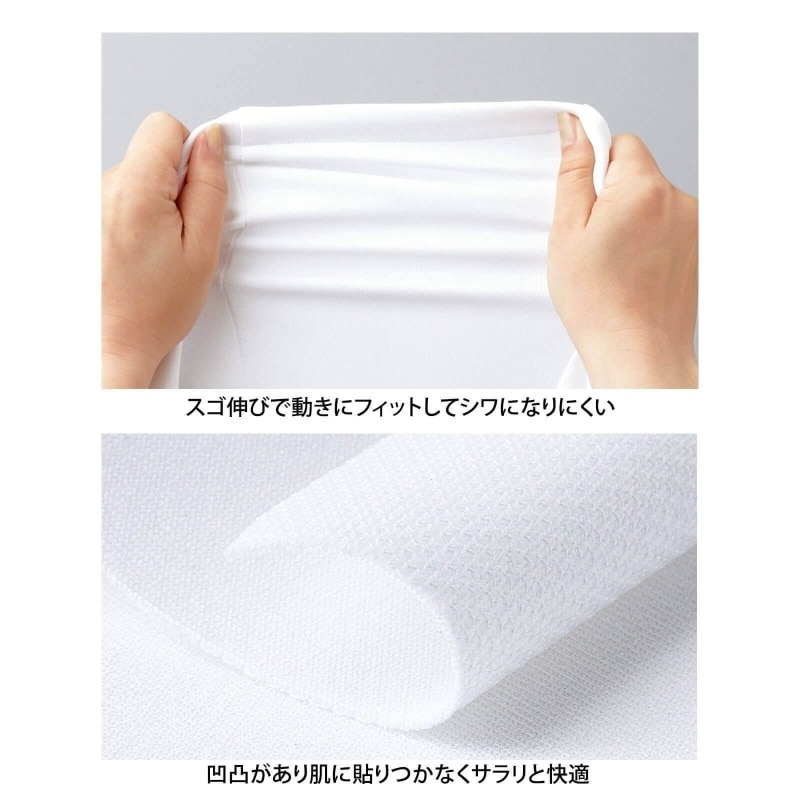 抜群のストレッチ性で軽やかに動きにフィット。肌に密着しにくく汗ばむ季節も快適に着用できます。