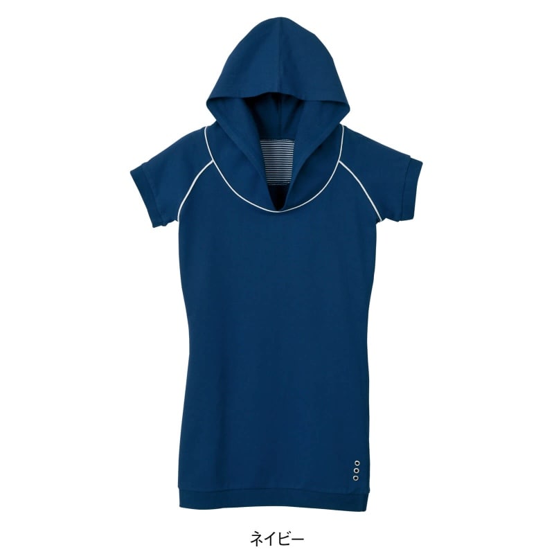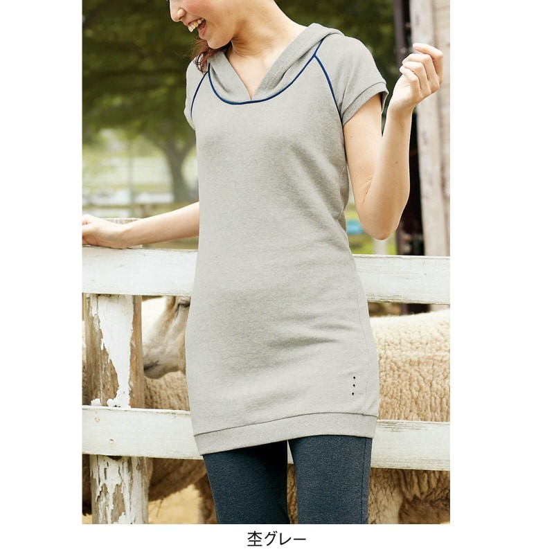 配色ステッチを効かせたラグラン袖にフードも付いたワンピは、ほどよくキュート。ボーダーの背当てや左裾のハト目でおしゃれに味付け。