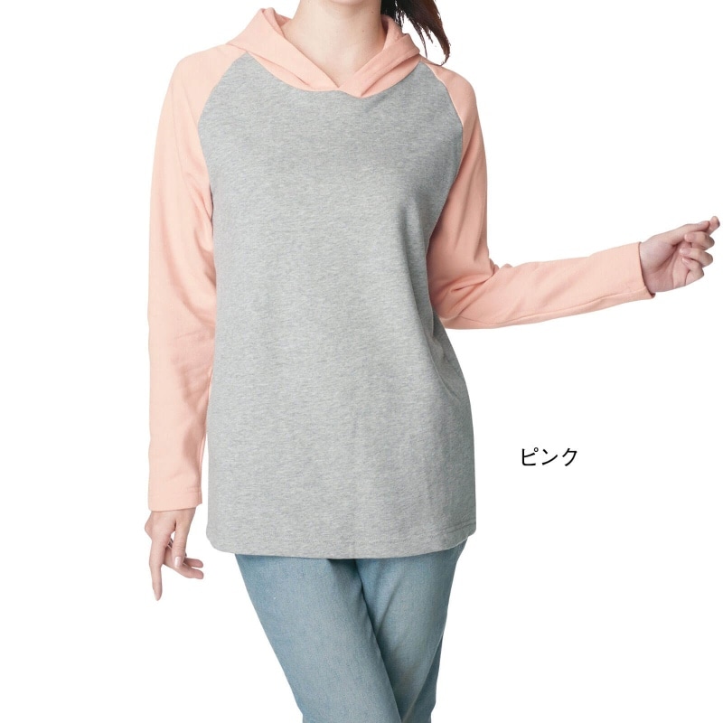 配色のラグラン袖がスポーティーな1枚。ゆったりと身丈が長く、裏起毛素材で暖かな着心地です。