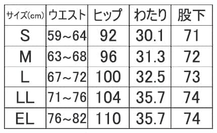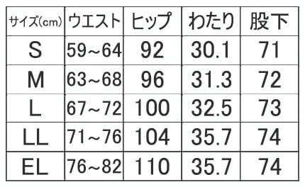 | サイズ (cm) | ウエスト対応 | ヒップ | わたり | 股下 |