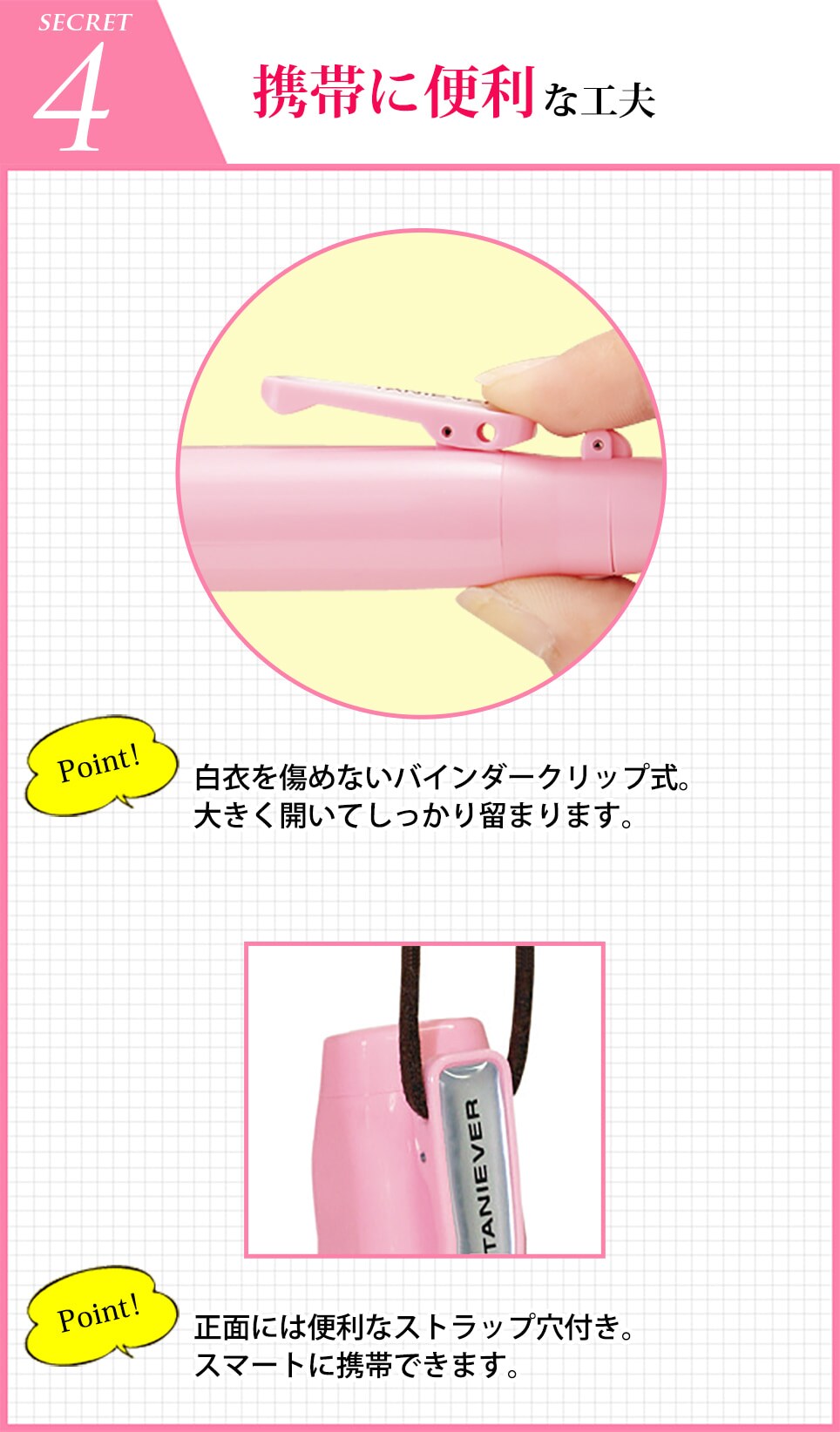 ●大きく開いてしっかり留まり、白衣を傷めないバインダークリップ式