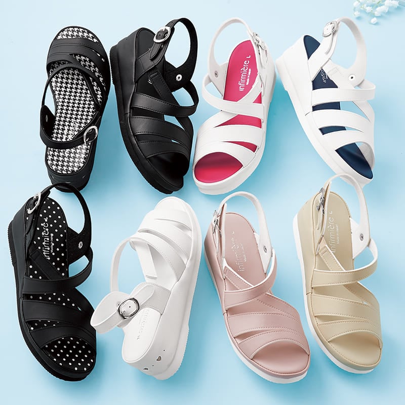 甲にフィットし、脱げにくく歩きやすいナースサンダル定番のクロスサンダル。足元をすっきり綺麗に見せてくれるシルエットで、おしゃれと機能性を兼ね備えています。エアークッション入りで衝撃をやわらげ、疲れにくいタイプや、シーンに応じて履き分けできる2WAYタイプ、かわいいチャームがアクセントになったサンダルなど、豊富なバリエーションをご用意しています。