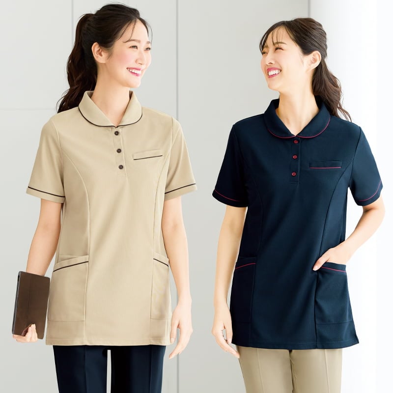 【モズ】首元すっきり!Tシャツタイプののびやか綿混スクラブ!