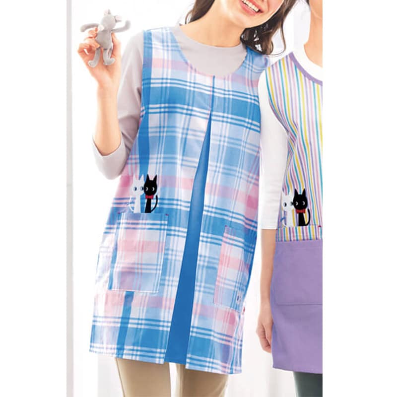 ポケット&襟ぐりを配色チェックで統一の可愛いデザインエプロン