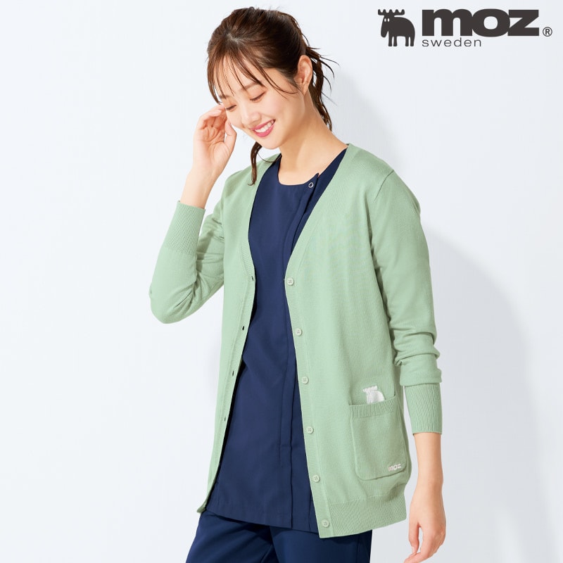 【モズ】エルクの刺しゅうが覗くポケット付きカーディガン。衿裏の配色もポイント