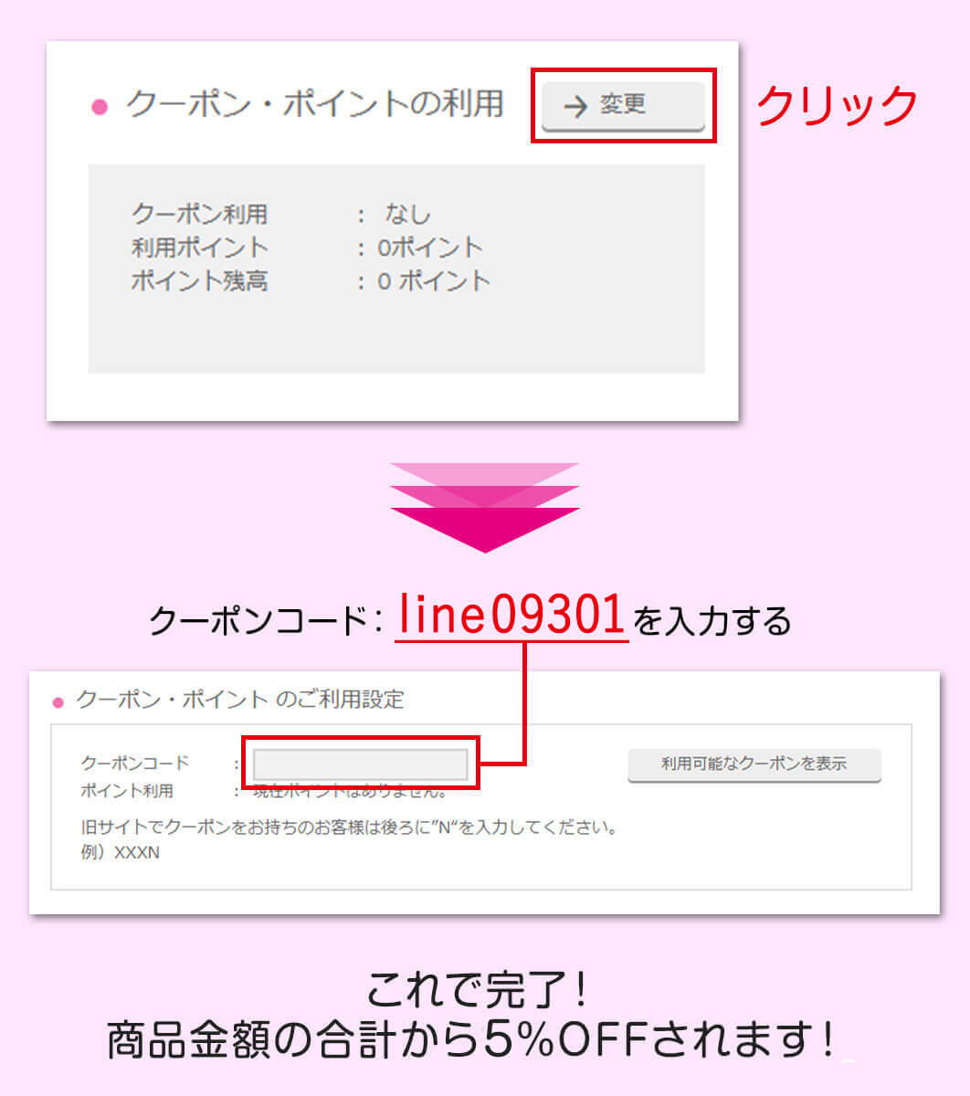 - ※クーポンコードをお控えの上、「ご注文内容確認」ページのクーポンコード入力欄にいれてください。