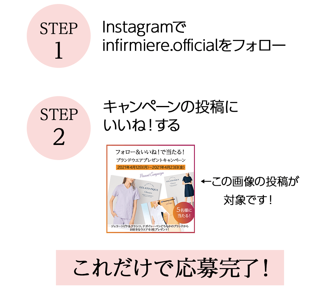 アンファミエ公式インスタグラムをフォローし、対象投稿画面に『いいね』をしてくださった方の中から抽選で5名様にジェラート ピケ&クラシコ・ナガイレーベンの商品の中からお好きなウエアを1枚プレゼントいたします。