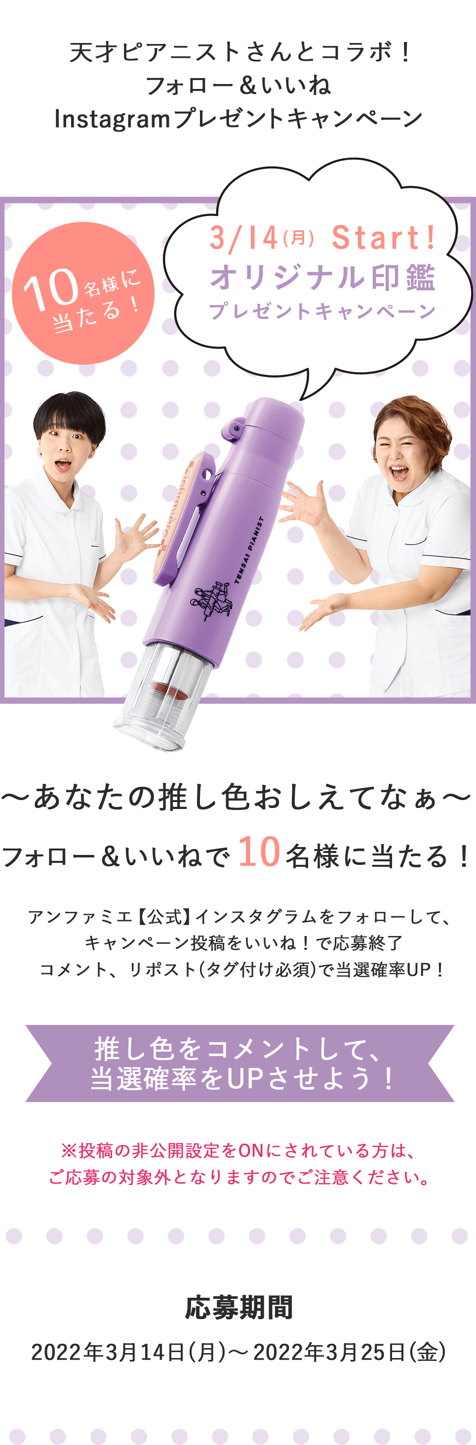 ・ 厳正なる抽選の結果、当選者にはキャンペーン終了後にアンファミエ公式アカウントよりインスタグラムのダイレクトメッセージで当選通知を送信します。