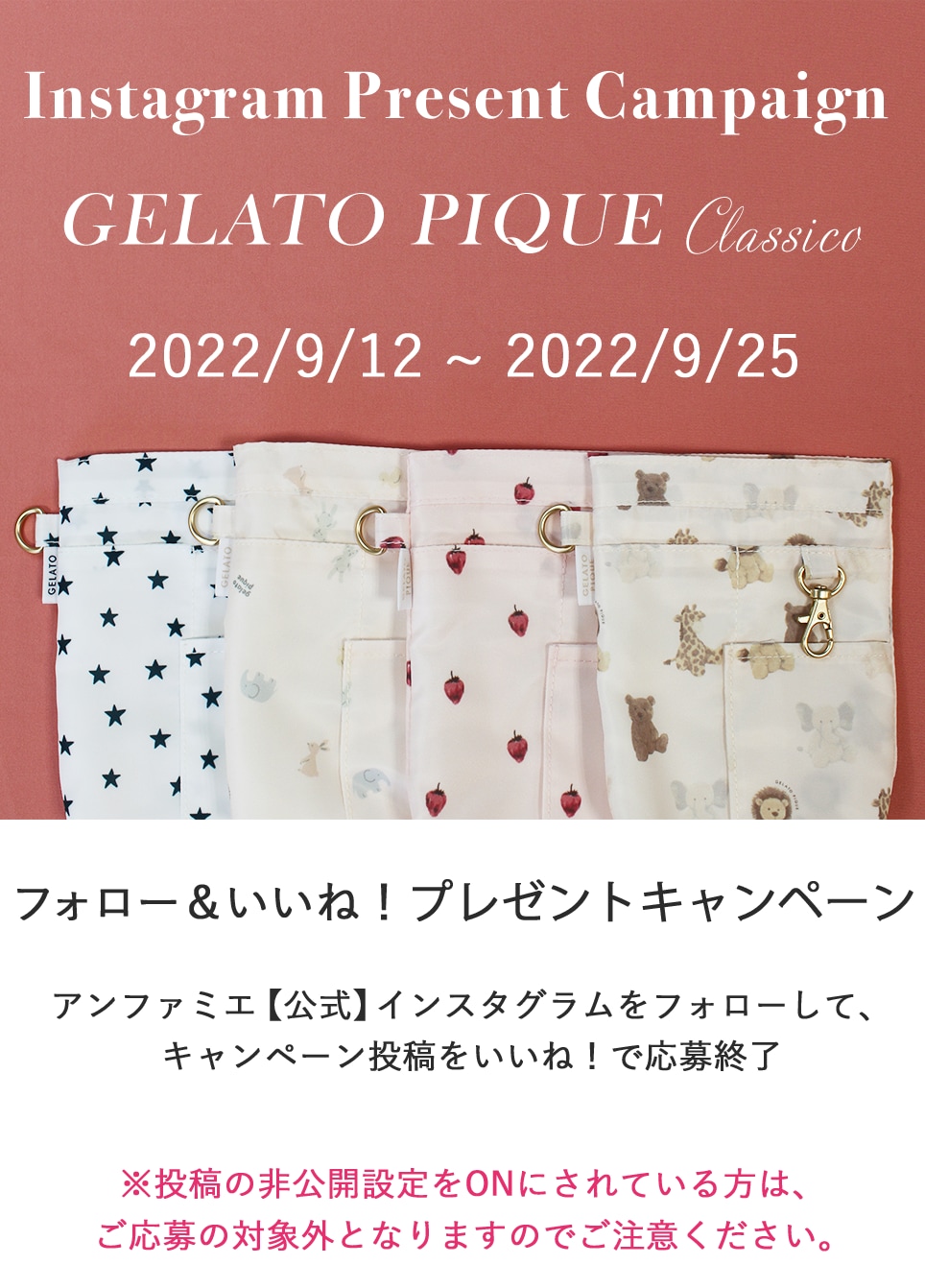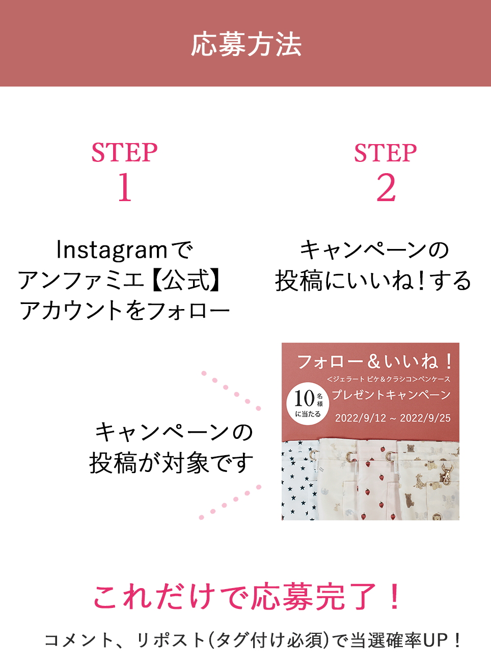 ・ その際、アンファミエ公式インスタグラムアカウントのフォローをはずされておりますと当選連絡ができなくなりますので、ご注意ください。