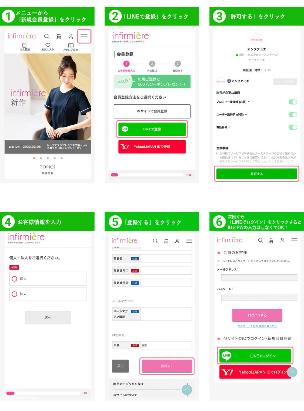 - ・楽天市場、Yahoo!ショッピング、Amazonなどショッピングモールやハガキ、FAX、電話でのアンファミエの会員情報や、他のLINEアカウントは対象外となります。