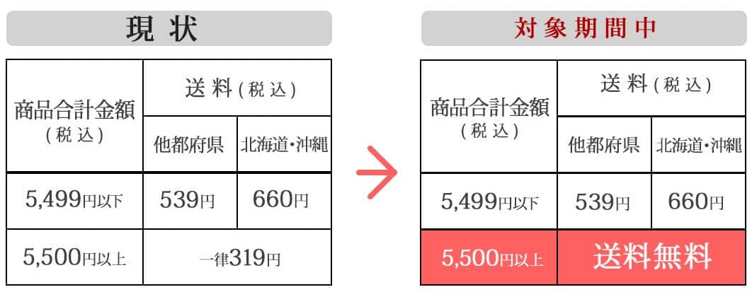 - ※数カ所のお届け商品合計が5,500円(税込)以上でも、送料は無料にはなりませんのでご了承ください。