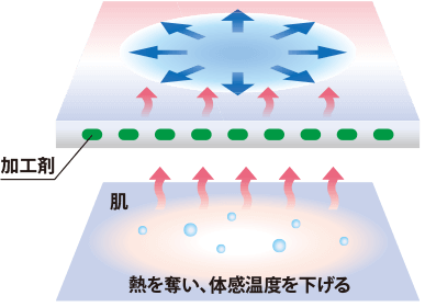 温度が高い時には、汗を素早く拡散・蒸発させ、気化熱で熱を奪い体感温度を下げます。