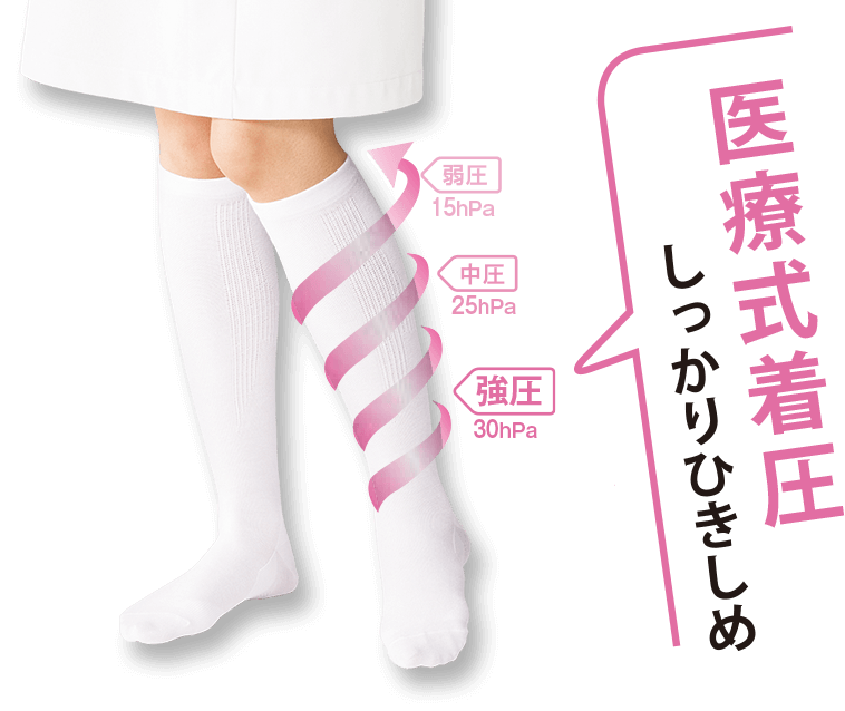 一般医療機器の製造・販売の免許を取得している工場が作った、立ち仕事が多い看護師さんの為に設計して作られた着圧ハイソックス