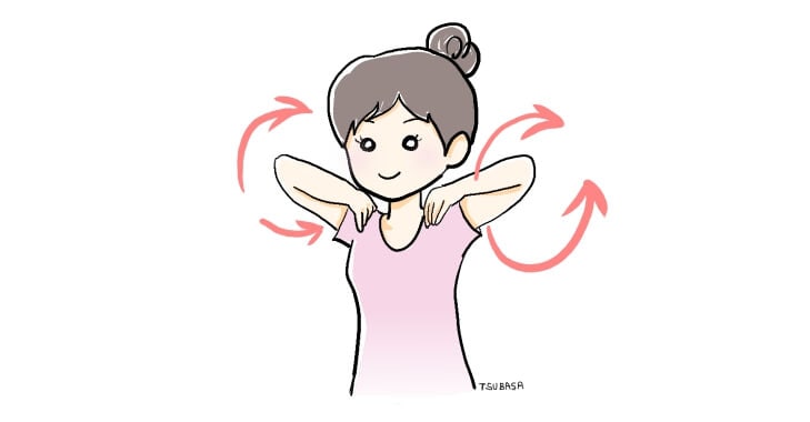 肩こりに悩まされる時は三角筋と僧帽筋をほぐしましょう。両手を軽く肩に乗せ、肘で大きな円を描くようにぐるぐると回します。この際、背中が丸まらないようにしてください。肩甲骨がしっかり動いていることを意識してストレッチしましょう。10回終わったら逆回しです。