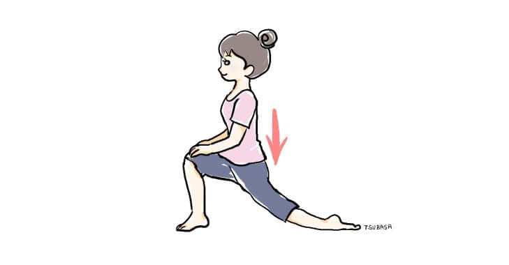 立位の状態から、右足を大きく一歩前に出して踏み込み、左足を後ろに引きながら膝を曲げ床につきます。息を吐きながら腰を下ろして腸腰筋を伸ばします。無理のない範囲で伸ばしていきましょう。足を入れ替えて2~3回行います。