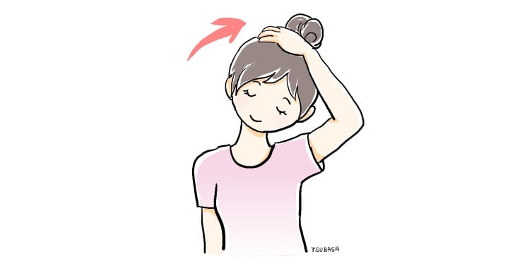 首をほぐすにはまっすぐ座った状態で左側頭部に右手を当て、息を吐きながら右横にゆっくりと首を倒します。次にやや後頭部に手を当て、右斜め前に首を倒します。