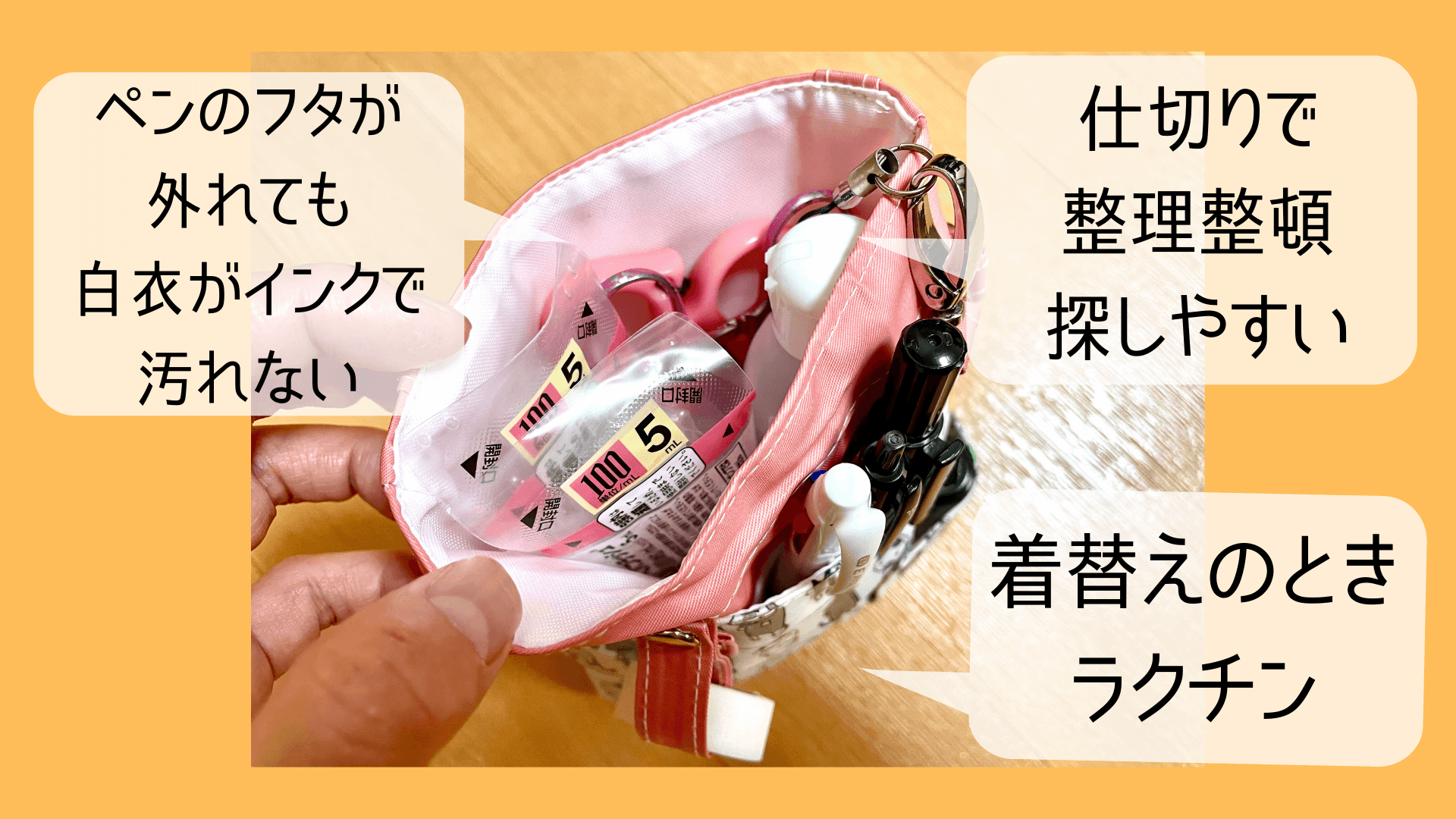 ポケットの中の整理整頓と白衣を汚したくない看護師さんにはペンケースは必須のアイテムですね。