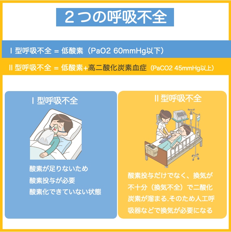 ・2型呼吸不全は「低酸素+高二酸化炭素血症(PaCO2 45mmHg以上) 」