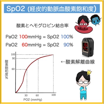 PaO2は酸素化の指標で、通常値は100mmHg程度です。PaO2(動脈血酸素分圧)と後述するPaCO2(動脈血二酸化炭素分圧)は動脈血液を採血し測定します。動脈血を毎回測定することは、患者にも医療者にとっても負担が大きいです。そのため酸素化の評価にはSpO2がよく用いられています。上記に示したPaO2 60mmHgをSpO2に置き換えると約90%程度です(酸素解離曲線)。