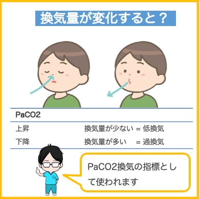 PaCO2は動脈血中の二酸化炭素の量を示しています。換気量が増えると、息から体外へ吐かれる二酸化炭素の量が上昇するため、体の中(血中)のPaCO2は低下します。逆に換気量が低下すると、息から体外へ吐かれる二酸化炭素の量が低下するため、体の中(血中)のPaCO2は上昇します。PaCO2は換気の量で変動するため換気の指標です。