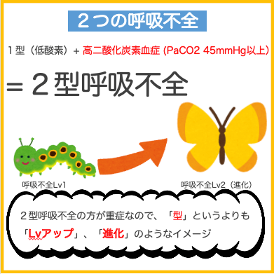 つまり呼吸不全とは①「低酸素」、②「高二酸化炭素血症」を評価することでわかります。また1型、2型と別れていると一見別のものに見えるかもしれません。しかし、2型呼吸不全は1型呼吸不全が重症化しているので、別のものと捉えるよりも「レベルアップ」、「進化」しているとイメージする方が分かりやすいと思います。