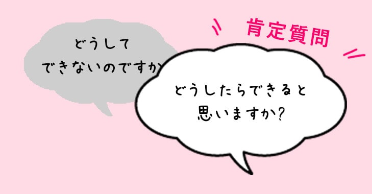 どうして・なぜ等、できなかった要因を聞くような質問(否定質問)ではなく、相手が肯定的な気持ちで考えられる質問法です。