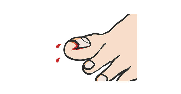 Tさんは毎日歩行練習を継続して歩行状態が安定してきました。しかし、ある日担当者が訪室して掛け布団を剥がすと、シーツが血だらけ……。出血したところを探すと、親指の爪が何かに引っかかり剥がれかかり根本だけくっついた状態でした。原因は爪が伸びて衣類や布団にかかったことが考えられました。Tさんは足が痛いし、爪のところを処置されていて靴も履きにくいし、歩行練習はしたくない、リハビリはお休みしたいと言います。