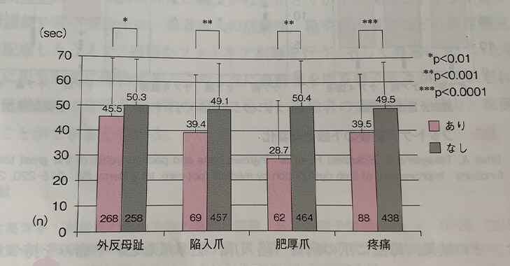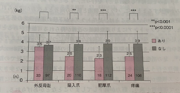 こちらの資料1)2)は、母趾のトラブルの有無で開眼片足立ち時間や趾間力を運動の能力の差を調べています。ここからわかるのは、外反母趾・陥入爪・肥厚爪・疼痛がある人はない人に比べ、開眼片足立ち時間、趾間力とも低いことがわかります(*趾間力は外反母趾で有意差なし)。