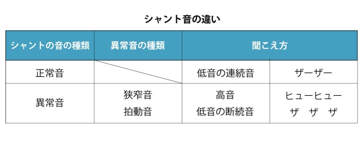 先に述べたようにシャントとは、静脈血管に動脈血を流し入れているため、ペラペラな血管に今まで流れたことのない高圧な血液が流れるため音が漏れ聞こえ、また逆流弁にぶつかることで音が聞こえ始める、これがシャント音ということになります。