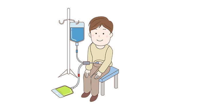 腹膜透析とは、透析液をお腹に溜めたうえで腹膜を利用し血液中の尿毒素や余分な水分を取り除く治療法です。