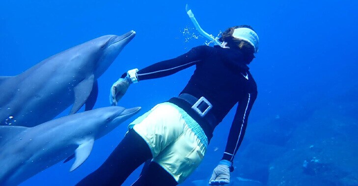 今回、約8000円で船頭さんがガイドをしてくれるドルフィンスイムツアーに参加しました。ウエアに着替え、さっそく船に乗り込みます。ちなみに船酔いされる方は乗船前に薬を飲むことをおすすめします。出発すること約数分。早々にイルカの群れを発見しました。すぐに飛び込めるようゴーグル、シュノーケル、フィンを装着。船頭さんの合図で、イルカを驚かせないよう静かに海に入ります。真っ青な海の中に潜ると、ゆったりと自由に泳いでいるイルカたちの姿があちこちに。親子で身を寄せながら泳ぐイルカも多くいます。この日は運よく、ウミガメやたくさんの魚にも遭遇しました。静寂な海の中では、イルカの鳴き声が響き渡ります。神秘的で迫力ある姿にうっとり。愛くるしいイルカの姿に、身も心も癒されること間違いなしです。