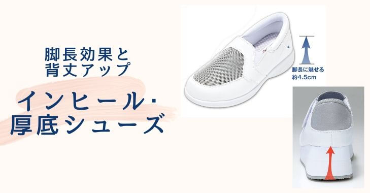 「インヒール」とは、外からはわかりにくいのですが、靴の中に高さをもたせていて、ヒールのある靴を履いたような効果があります。ヒールと違って安定感があり、普通のシューズと履き心地に大きな差はありません。