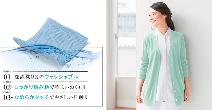 3つめのキーワードは「肌ざわり」です。思わず頬ずりしたくなるふわふわ、もちもち感が新しいナースカーディガンのトレンドとしてやって来ました。もちろん、アンファミエのカーディガンは肌ざわりの良さだけでは終わりません。ウォッシャブルやポケットなど、ナースにうれしい機能は標準装備です!