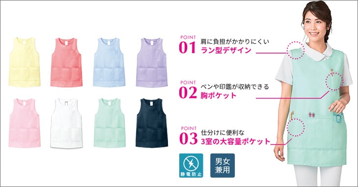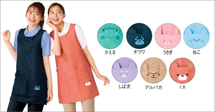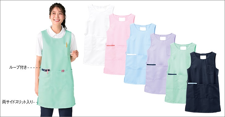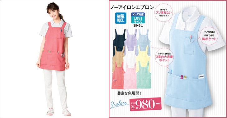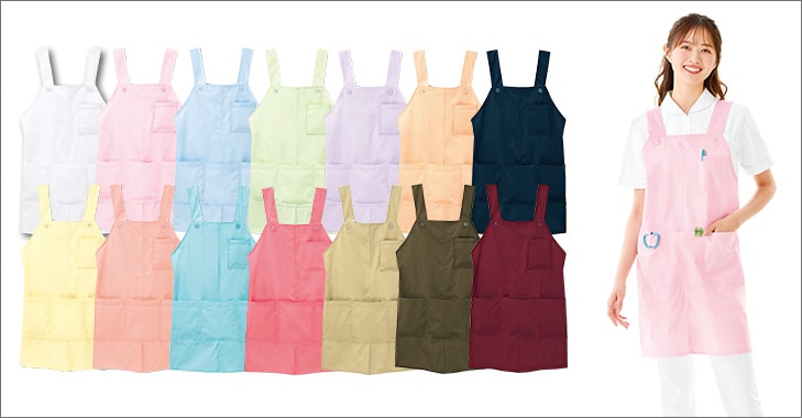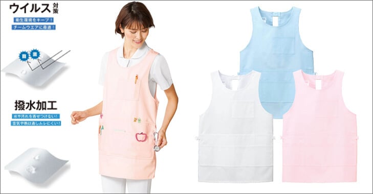 感染対策で必要性が再認識されているエプロン。アンファミエでも白衣に合ったおしゃれなカラーや、男性も着られる大きいサイズのエプロン、小児科ナースさんや保育士さん向けにキャラクターエプロンなど、数多く取り揃えています。